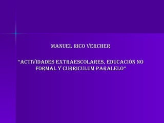 Este documento describe el currículo paralelo y las actividades extraescolares como una forma de complementar la educación formal. Propone que el currículo paralelo puede abarcar áreas como idiomas, ciencias, música, deportes y tecnología. También sugiere que este currículo flexible puede capacitar a personal no docente y actualizar a los profesores en nuevas metodologías y tecnologías.
