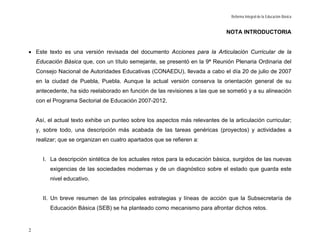 Este documento describe los retos actuales de la educación básica en México y las estrategias para enfrentarlos. Identifica problemas como el rezago educativo, la falta de equidad y baja calidad, y retos como atender la diversidad estudiantil y elevar logros escolares. Propone cinco líneas estratégicas de la SEB como la articulación curricular, el nuevo federalismo educativo y el uso de TIC. El objetivo es consolidar reformas recientes y mejorar la educación para cumplir metas internacionales de cobertura y calidad en la educ