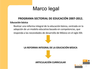 La reforma integral de la educación básica en México busca mejorar la calidad educativa a través de la articulación de los programas de estudio de preescolar, primaria y secundaria, con un enfoque basado en competencias. El documento describe los aspectos clave de esta reforma curricular, incluyendo la definición de competencias, perfiles de egreso, y una nueva evaluación de aprendizajes alineada con los estándares curriculares.