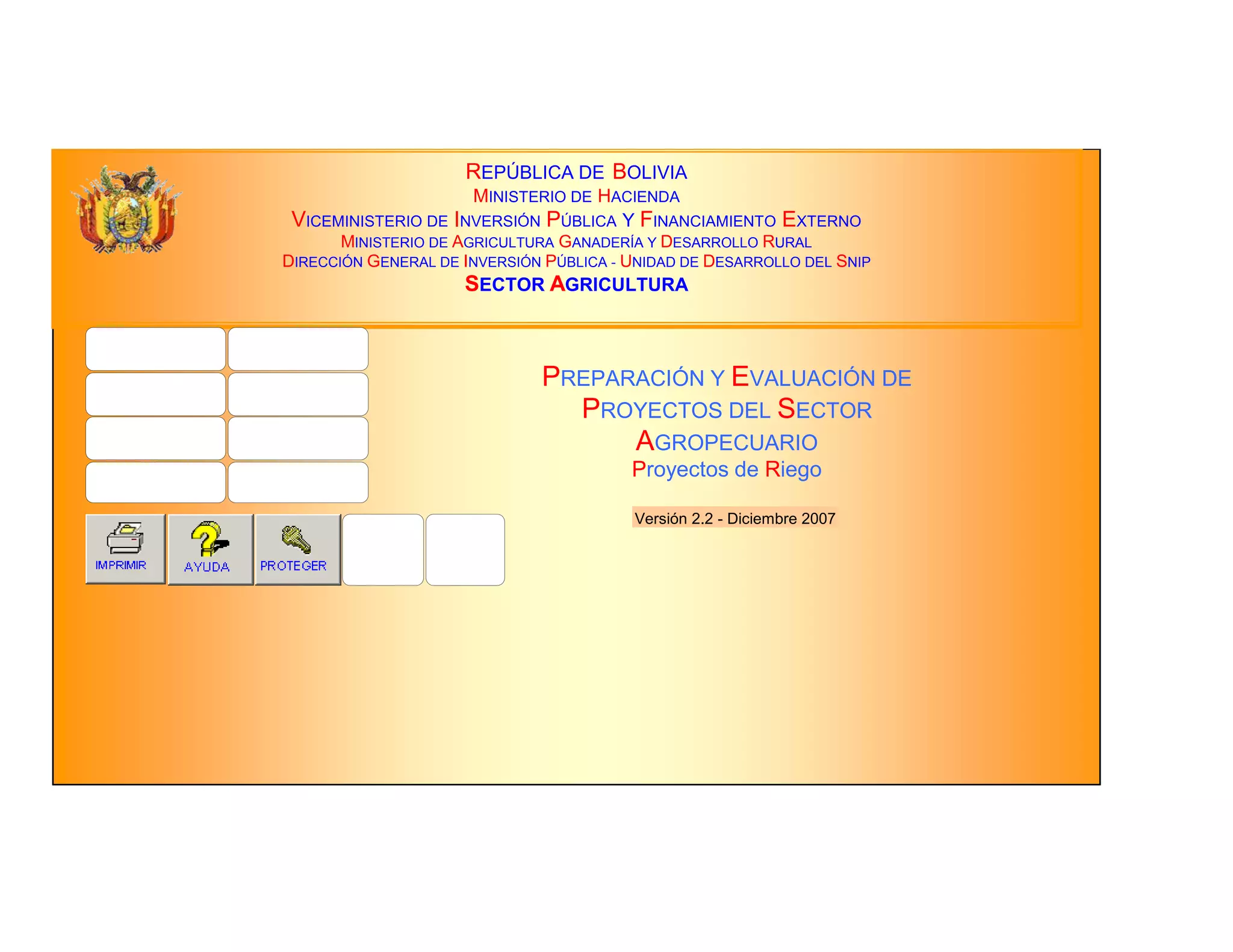 Este documento proporciona una guía para la preparación y evaluación de proyectos del sector agropecuario en Bolivia. Describe los pasos para definir un proyecto de riego, incluyendo la descripción del área y población beneficiada, los impactos ambientales potenciales, la producción agrícola actual y proyectada, y el análisis financiero del proyecto. El objetivo es evaluar alternativas para aumentar la producción agrícola a través de nuevos sistemas de riego.