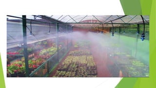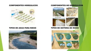 El documento describe diferentes sistemas de riego para cultivos, incluyendo riego por goteo, nebulización, gravedad e inundación. Explica los componentes, ventajas y desventajas de cada sistema. También cubre temas como filtrado, control de presión, fertilización y partes de un sistema de riego hidropónico.