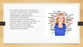 Este documento describe los riesgos psicosociales en el trabajo y sus causas. Explica que los riesgos psicosociales perjudican la salud de los trabajadores y pueden causar estrés y enfermedades a largo plazo. Estos riesgos son consecuencia de una mala organización del trabajo, no de problemas individuales. También señala que la evaluación de riesgos psicosociales debe centrarse en las características de la organización del trabajo y no en las características individuales de los trabajadores.
