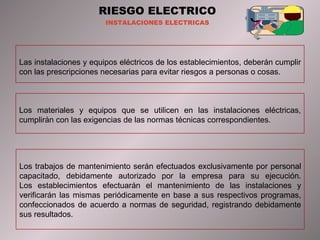 El documento habla sobre los riesgos eléctricos en el trabajo. Describe la importancia de mantener las instalaciones eléctricas en buen estado y realizar trabajos de mantenimiento solo por personal capacitado. También define conceptos eléctricos como corriente, tensión y resistencia. Explica los efectos de la electricidad en el cuerpo humano y los primeros auxilios en caso de electrocución.