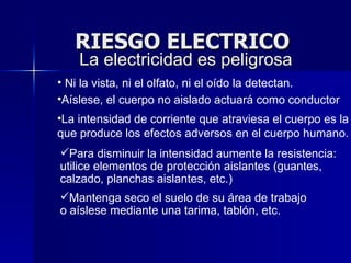 El documento describe los riesgos eléctricos y cómo evitarlos. Explica que los contactos eléctricos pueden ser directos o indirectos y que la intensidad de la corriente es lo que causa daños. Recomienda usar equipos de protección aislantes como guantes y calzado y mantenerse y el suelo seco. Además, aconseja no sobrecargar enchufes, usar ladrones, trabajar cerca de lugares mojados, encender o apagar luces con las manos mojadas, y siempre desenchufar los aparatos