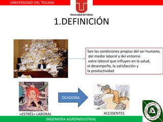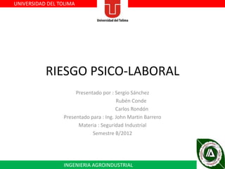 Este documento presenta un estudio sobre riesgos psicolaborales realizado por estudiantes de Ingeniería Agrícola de la Universidad del Tolima. El estudio define los riesgos psicolaborales, los clasifica en factores personales, laborales y organizacionales, y analiza sus efectos en la salud, incluyendo estrés, accidentes y patologías. También examina instrumentos para medir riesgos psicolaborales y métodos de prevención.