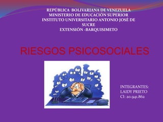Este documento define y explica los diferentes tipos de riesgos psicosociales en el trabajo como el estrés laboral, el burnout, el mobbing (acoso laboral), el acoso sexual y la violencia física. Describe cada uno de estos riesgos y sus causas, síntomas y efectos. También identifica los factores individuales y ambientales que pueden generar estos riesgos psicosociales y la necesidad de evaluarlos para implementar medidas preventivas que promuevan el bienestar de los trabajadores.