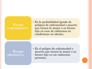 El documento define el riesgo reproductivo como la probabilidad de enfermedad o muerte de la mujer o el feto durante el embarazo bajo condiciones no ideales. Explica que el riesgo reproductivo incluye el riesgo preconcepcional, obstétrico y perinatal, y depende de factores biológicos, ambientales, sociales, económicos y de estilo de vida. Finalmente, diferencia el riesgo preconcepcional, que evalúa a mujeres no embarazadas, del riesgo obstétrico,