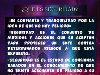 La seguridad se define como un conjunto de medidas adoptadas para proteger a un ente de riesgos y peligros. Se basa en la confianza y tranquilidad que se genera al saber que no hay acechanza de peligro. Cada actividad conlleva inherentemente un riesgo o peligro que debe ser gestionado mediante acciones específicas.