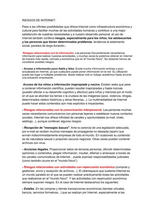 El documento describe varios riesgos asociados con el uso de Internet, incluyendo acceso a información poco fiable o inapropiada, recepción de mensajes no deseados, estafas y robos relacionados con transacciones económicas, espionaje de datos personales, y problemas técnicos que pueden interrumpir el acceso a la red.