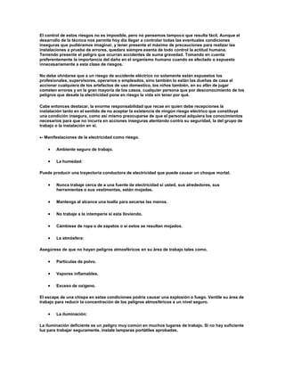 Este documento describe los principales riesgos eléctricos en el lugar de trabajo y cómo prevenirlos. Los riesgos incluyen la humedad, atmósferas peligrosas y mala iluminación. También enfatiza la importancia de usar equipos de protección como cascos y guantes aislantes, y seguir procedimientos seguros al usar herramientas eléctricas. El mantenimiento de un lugar de trabajo ordenado y libre de peligros es responsabilidad de cada trabajador.