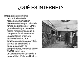 Internet es una red mundial de redes interconectadas que usan protocolos TCP/IP. Sus orígenes se remontan a 1969 con la primera conexión entre universidades en California y Utah. Las redes sociales son sitios web que permiten a los usuarios mantenerse en contacto e intercambiar información personal. Algunos problemas con las redes sociales incluyen la falta de conciencia sobre la privacidad de datos y la posibilidad de que la información sea utilizada de forma ilícita o publicada sin autorización.