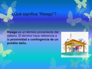 El documento describe los riesgos que pueden ocurrir en la escuela y cómo prevenir accidentes. Define riesgo como la posibilidad de daño y explica que los accidentes escolares representan un problema de salud pública. Identifica áreas de la escuela que pueden ser peligrosas como escaleras sin barandas o cables eléctricos expuestos. También menciona objetos como útiles escolares, equipos deportivos o herramientas que pueden causar lesiones. Finalmente, ofrece recomendaciones para que tanto estudiantes como personal escolar eviten situaciones de