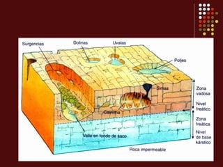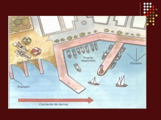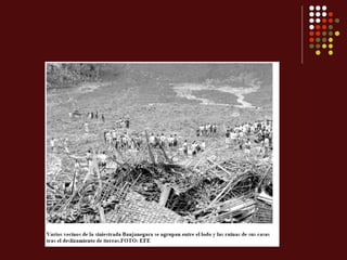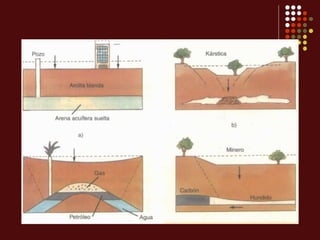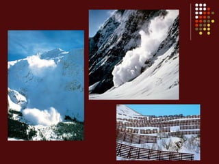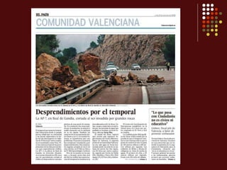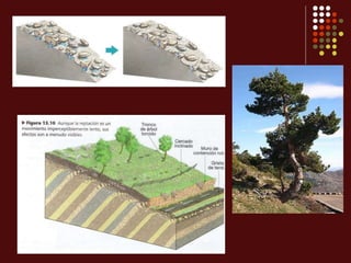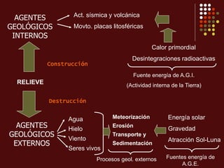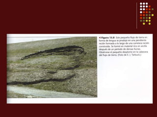 Este documento describe los diferentes tipos de riesgos geológicos externos como movimientos de laderas, inundaciones y riesgos costeros. Explica los factores que desencadenan estos fenómenos como lluvias intensas o actividad humana, así como medidas para prevenirlos mediante la ordenación del territorio y obras de ingeniería.