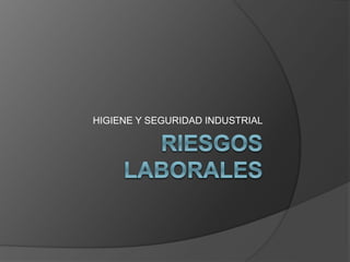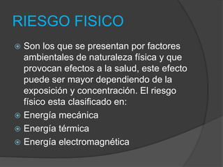 El documento describe los principales riesgos físicos, químicos y biológicos en el lugar de trabajo. Entre los riesgos físicos se encuentran la energía mecánica (ruido y vibraciones), energía térmica (calor y frío) y energía electromagnética (radiaciones ionizantes y no ionizantes). Los riesgos químicos incluyen sustancias explosivas, corrosivas, tóxicas e irritantes. Finalmente, los riesgos biológicos son organismos vivos como bacterias, protozoos,