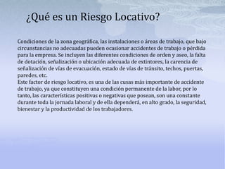 Este documento describe los riesgos locativos, que son las condiciones de la zona de trabajo que pueden ocasionar accidentes. Se clasifican según su fuente como la estructura, distribución de espacios, techos, pisos, etc. Se encuentran en las construcciones y su mal estado puede causar atrapamientos, caídas u otros golpes. Para prevenir accidentes, es importante mantener las instalaciones limpias y en buen estado e inspeccionar periódicamente los lugares de trabajo.