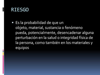 Este documento describe los diferentes tipos de riesgos a los que están expuestos los trabajadores, incluyendo riesgos físicos, químicos, biológicos, ergonómicos, eléctricos, mecánicos y psicosociales. También define el riesgo profesional como accidentes o enfermedades relacionadas con el trabajo, y explica que la prevención de riesgos incluye inspecciones integrales, de seguridad e inspecciones planeadas para identificar y mitigar los peligros. El objetivo general es proteger