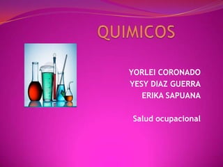 El documento describe los riesgos químicos en el lugar de trabajo, incluidos los efectos agudos y crónicos de la exposición no controlada a agentes químicos. Explica que el Sistema General de Riesgos Profesionales busca prevenir y proteger a los trabajadores de enfermedades y accidentes relacionados con su trabajo. También clasifica los químicos por su estado físico, origen y efectos en la salud, e identifica medidas para controlar riesgos, prevenir enfermedades laborales y proteger a los trabajadores