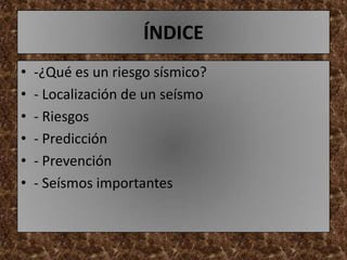 Este documento resume los conceptos clave sobre riesgos sísmicos. Explica que un riesgo sísmico se refiere a la posibilidad y efectos de un terremoto. Luego describe la localización de terremotos en límites de placas tectónicas, los riesgos directos e indirectos, métodos de predicción como fallas activas y precursores sísmicos, formas de prevención como equipos de emergencia y construcción antisísmica, y algunos de los terremotos más devastadores como el maremoto de 2004 en el océano