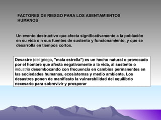 Este documento describe los diferentes tipos de riesgos y desastres naturales y antrópicos que afectan a los asentamientos humanos. Explica que un desastre ocurre cuando hay la combinación de un fenómeno perturbador como un huracán, terremoto u otro evento, y asentamientos humanos vulnerables expuestos a dicho evento. Describe los factores de riesgo como la ubicación de los asentamientos, la desigualdad social y el desconocimiento de medidas de prevención. Además, clasifica los riesgos en ge