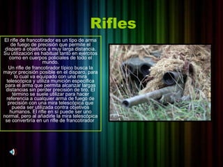 Rifles El riflede francotirador es un tipo de arma de fuego de precisión que permite el disparo a objetivos a muy larga distancia. Su utilización es habitual tanto en ejércitos como en cuerpos policiales de todo el mundo. Un rifle de francotirador típico busca la mayor precisión posible en el disparo, para lo cual va equipado con una mira telescópica y utiliza munición específica para el arma que permita alcanzar largas distancias sin perder precisión de tiro. El término se suele utilizar para hacer referencia a cualquier arma de fuego de precisión con una mira telescópica que pueda ser utilizada contra objetivos humanos. El rifle en sí puede ser uno normal, pero al añadirle la mira telescópica se convertiría en un rifle de francotirador .