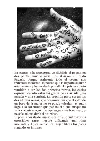La rima XXIII de Bécquer expresa el gran amor que sentía por su amada a través de la hipérbole, anáfora y paralelismo. El poema sugiere que daría un mundo por una mirada de ella, un cielo por su sonrisa, y que no sabe lo que daría a cambio de un beso suyo debido a lo invaluable que es para él.