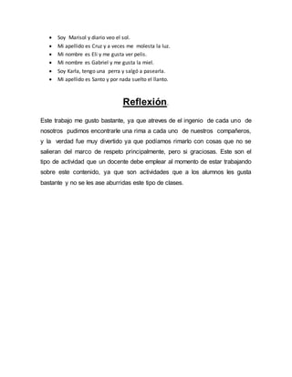 Este documento contiene una serie de pareados de rimas que describen a personas mediante su nombre y apellido y algo que les gusta. Cada pareado sigue el patrón de rima asonante y ofrece información sobre la persona como su nombre, apellido y un detalle sobre sus gustos. Al final, hay una reflexión sobre la actividad que destaca que fue divertido crear las rimas de forma ingeniosa y respetuosa, y que este tipo de dinámicas hacen que los estudiantes disfruten del contenido.