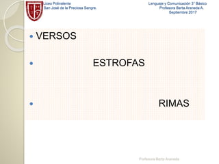 El documento presenta una lección sobre los elementos básicos de la poesía, incluyendo versos, estrofas y tipos de rima. Explica que los versos son las líneas de un poema, las estrofas son conjuntos de versos relacionados por medida y rima, y que existen dos tipos principales de rima: rima consonante cuando coinciden vocales y consonantes, y rima asonante cuando solo coinciden las vocales. Incluye ejemplos de poemas para ilustrar estos conceptos.