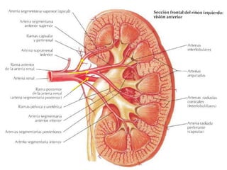 Este documento describe la anatomía de los vasos sanguíneos y nervios del riñón. Explica que la arteria renal se origina en la aorta abdominal y se divide en ramas capsulares inferiores y ureterales superiores. Estas ramas se subdividen en órdenes primero y segundo que irrigan el riñón. También describe las venas que drenan la sangre de la cápsula renal, así como los nervios esplácnicos mayor y menor que inervan el riñón. Finalmente, resume brevemente los conductos excretores