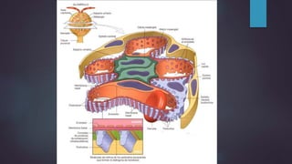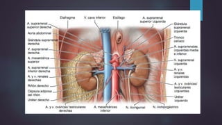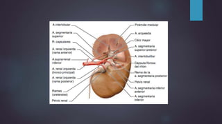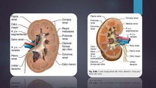 Este documento describe la anatomía y fisiología del riñón y la vía urinaria. Explica que los riñones filtran la sangre para formar y concentrar la orina, la cual pasa a la vejiga a través de los uréteres. También cubre síndromes como la glomerulonefritis aguda y crónica, insuficiencia renal aguda, infecciones del tracto urinario y nefrolitiasis. Finalmente, brinda una breve introducción sobre la patogenia de las enfermedades glomerulares.
