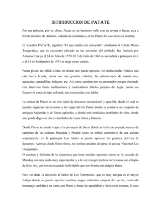 Patate es un valle hermoso ubicado a 30 minutos de Ambato, Ecuador. Es conocido por sus paisajes y cultivos de frutas como mandarinas, aguacates y granadillas. La ciudad de Patate ofrece sitios para descansar y excursiones a haciendas históricas y destilerías de vino. El Valle del Río es una hostería turística reconocida por su criadero de truchas y quesería.