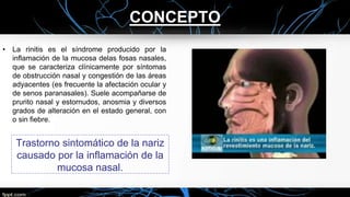 La rinitis es un trastorno caracterizado por inflamación de la mucosa nasal, que causa obstrucción, congestión y otros síntomas como estornudos y prurito. La rinitis alérgica, que puede ser estacional o perenne, afecta a un 20% de la población y está relacionada principalmente con alérgenos. El tratamiento incluye medidas ambientales y farmacológicas, como antihistamínicos y corticosteroides, y se deben realizar diagnósticos diferenciales con otras condiciones nasales.