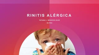 La rinitis alérgica es una enfermedad inflamatoria crónica de la mucosa nasal que causa síntomas como prurito, estornudos y rinorrea. Representa un problema global de salud pública y a menudo se asocia con otras comorbilidades como asma. El diagnóstico se basa en la historia clínica, pruebas alergológicas e imágenes médicas. El tratamiento incluye medidas no farmacológicas y fármacos como antihistamínicos y antileucotrienos.