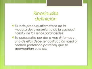 Este documento describe la rinosinusitis, definiéndola como un proceso inflamatorio de la mucosa nasal y los senos paranasales. Explica que puede ser aguda, recurrente, crónica o bacteriana, y enumera los síntomas y factores de riesgo. También detalla la anatomía patológica, vías de diseminación, etiología bacteriana más común, diagnóstico, tratamiento y posibles complicaciones como abscesos orbitales y meningitis. En general, provee una descripción completa de la rinosinusitis aguda y sus