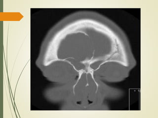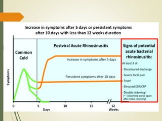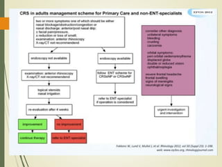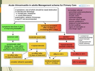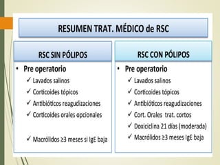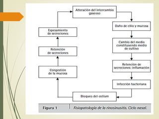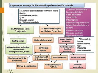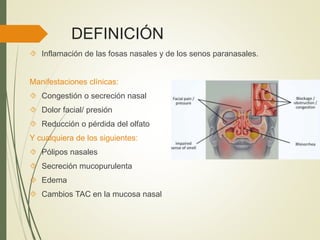 La rinosinusitis es la inflamación de las fosas nasales y los senos paranasales. Puede ser aguda (menos de 12 semanas) o crónica (más de 12 semanas). Los síntomas incluyen congestión nasal, secreción, dolor facial y pérdida del olfato. El diagnóstico se basa en los síntomas y exámenes como TC. El tratamiento incluye irrigaciones nasales, corticoesteroides tópicos y sistémicos, y antibióticos. Las complicaciones incluyen la formación de muco