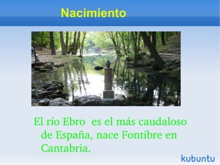 El río Ebro es el más largo de España con 910 km, nace en Cantabria y desemboca en el mar Mediterráneo cerca de Tortosa. Discurre por ciudades como Miranda de Ebro, Haro, Logroño, Zaragoza y recibe afluentes como el Jalón, Huerva, Aragón y Segre. Su caudal de 600 m3/s es aprovechado para el regadío y producción de energía.