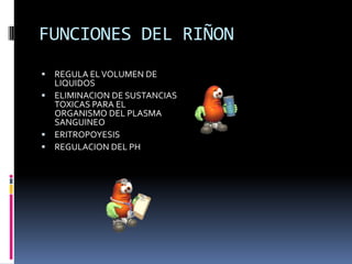 Este documento presenta información sobre la fisiología renal. Resume las principales funciones del riñón como regular el volumen de líquidos, eliminar sustancias tóxicas, apoyar la eritropoyesis y regular el pH. Describe brevemente la anatomía del riñón incluyendo su tamaño, estructuras y sistema de irrigación. Explica que la unidad funcional del riñón es el nefrón y que los mecanismos por los cuales cumple sus funciones son la filtración, reabsorción, secreción y excreción.