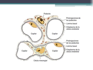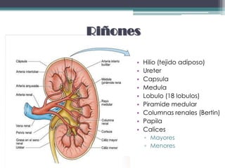 Los riñones tienen la forma de una haba o guisante y miden entre 10-12 cm de largo y 5-8 cm de ancho. Sus funciones principales son filtrar la sangre para producir orina, eliminar desechos de la sangre, y regular el volumen de agua y electrolitos en la orina. La unidad funcional del riñón es la nefrona, la cual contiene un corpúsculo renal y un sistema tubular.
