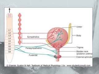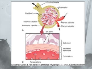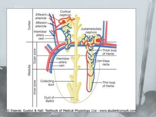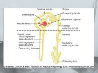 El documento describe el funcionamiento del riñón y el sistema urinario. Explica que el riñón filtra la sangre, regula los fluidos corporales y elimina desechos a través de los nefrones y túbulos renales que conducen a la vejiga para la eliminación de la orina.
