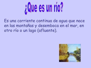 Este documento define los conceptos básicos de un río, incluyendo su curso, caudal y régimen. Explica que un río nace en las montañas y desemboca en el mar u otro río o lago. Describe los elementos clave de un río como torrentes y lagos, y las tres principales vertientes hidrográficas de España: Cantábrica, Mediterránea y Atlántica. También enumera algunos de los ríos más importantes de España como el Miño, Duero, Tajo, Guadiana y Guadalquivir.