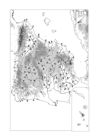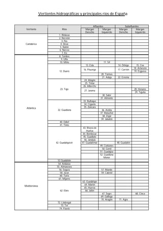 Este documento lista las principales cuencas hidrográficas y ríos de España. Identifica la cuenca Cantábrica, cuya principal corriente es el Duero, la cuenca del Tajo, la cuenca del Guadalquivir, la cuenca Atlántica, la cuenca del Ebro y la cuenca Mediterránea, y enumera los principales afluentes y subafluentes de cada una.