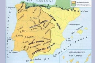 El documento describe las características hidrográficas de las principales cuencas fluviales de la Península Ibérica. La vertiente cantábrica se caracteriza por ríos cortos, rápidos y caudalosos con régimen nival y pluvial. La vertiente atlántica tiene ríos más largos e irregulares con caudales modestos y complejos regímenes. Los ríos del sur son muy irregulares y torrenciales con fuerte erosión, a excepción del Ebro.