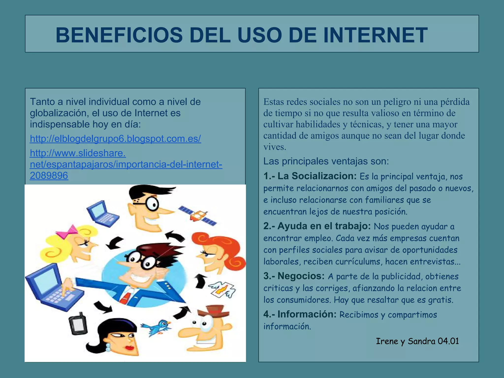 El documento describe los principales beneficios del uso de Internet, incluyendo la socialización, ayuda en el trabajo y los negocios, y acceso a información. También menciona algunos riesgos como la pérdida de privacidad y la posibilidad de ser víctima de ciberacoso.