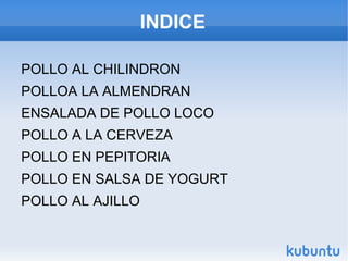 Este documento contiene recetas de pollo en diferentes estilos culinarios como pollo al chilindrón, pollo a la almendra, ensalada de pollo loco, pollo a la cerveza, pollo en pepitoria, pollo en salsa de yogurt y pollo al ajillo. Cada receta describe los ingredientes y los pasos básicos para preparar el plato, incluyendo saltear, asar, freír o cocinar el pollo con diversas salsas, verduras y otros acompañamientos.