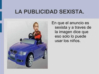 El documento analiza diferentes anuncios publicitarios y los clasifica como sexistas u engañosos. Algunos anuncios sugieren roles de género estereotipados o prometen resultados imposibles de lograr con el producto, como volar o mejorar las relaciones sociales. En general, el documento critica la forma en que ciertos anuncios utilizan imágenes o afirmaciones engañosas para vender productos.