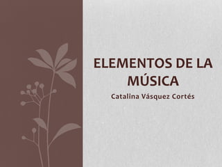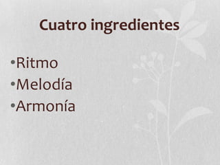 El documento describe los cuatro elementos fundamentales de la música: ritmo, melodía, armonía. Explica que el ritmo se basa en el intervalo entre elementos y puede verse como los pasos de una persona, la melodía es una sucesión lógica de sonidos, y la armonía es la más compleja con una secuencia vertical de sonidos como los acordes de la guitarra o piano.