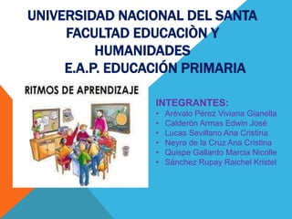 Este documento describe los diferentes ritmos de aprendizaje de los estudiantes. Define los ritmos como rápido, moderado o lento, y proporciona características de cada uno. Explica que los ritmos de aprendizaje dependen de factores como la edad, madurez, motivación y condiciones neurológicas. El objetivo es diseñar actividades educativas que se ajusten a los diferentes ritmos para que todos los estudiantes puedan avanzar a su propio ritmo.