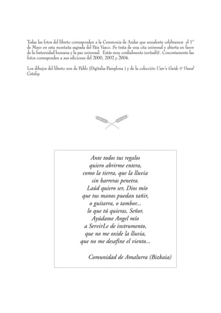 Este documento presenta una colección de oraciones, cantos y rituales universales para celebrar la unión y la fraternidad humana. Incluye oraciones de diferentes tradiciones espirituales de todo el mundo, así como cantos populares y rituales de paz de varias culturas. El objetivo es fomentar redes espirituales a través del diálogo interreligioso y la celebración de la unidad entre todas las personas.