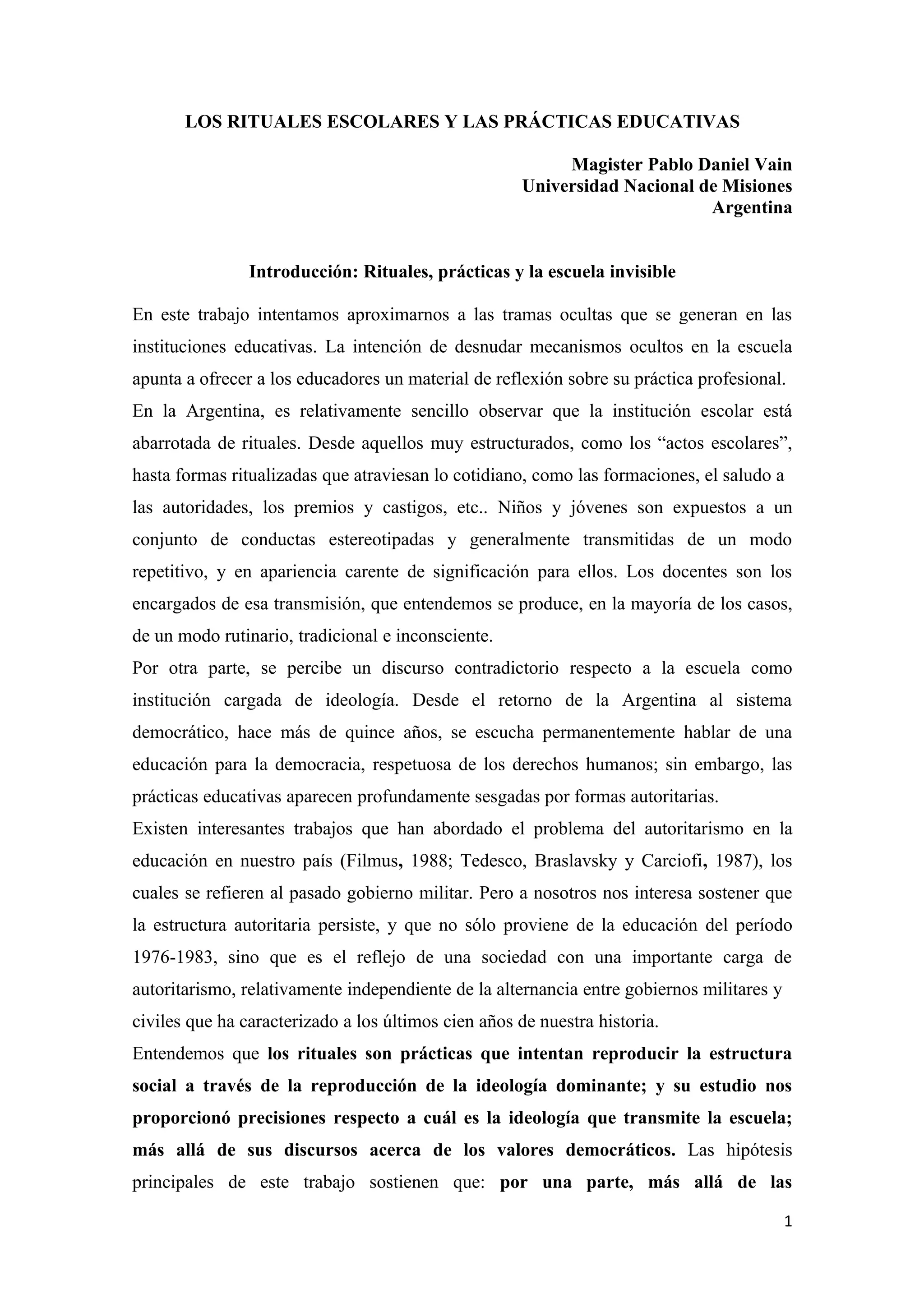 Este documento analiza los rituales y prácticas educativas en las escuelas argentinas. Sostiene que a pesar del discurso sobre la democratización de la educación, la escuela transmite una ideología autoritaria a través de rituales. Estos rituales reproducen la estructura social dominante e internalizan la ideología en los estudiantes de forma inconsciente. El autor estudia seis grupos de rituales y concluye que controlan a los estudiantes a través del espacio, el tiempo y las representaciones sociales, reforzando