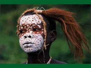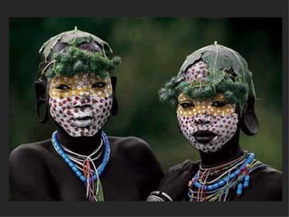 Las tribus que viven a lo largo del río Omo en Etiopia, como los Dassanech y Mursi, practican un arte corporal ancestral utilizando pigmentos naturales para decorar sus cuerpos de manera rápida y sin usar pinceles, siguiendo solo sus instintos. Aunque su arte carece de teoría, ha sido comparado con pintores modernos como Picasso y Pollock por sus trazos rápidos y es considerado puro ya que lo practican por placer y para seducir.