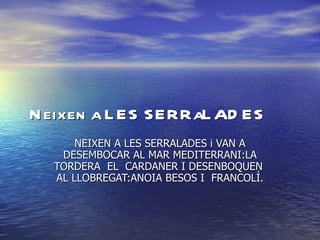 Este documento lista y describe los principales ríos de Cataluña. Nace en las montañas como los Pirineos y las Sierras Costeras y desembocan en el Mar Mediterráneo o el Río Ebro. Algunos de los ríos más importantes mencionados son el Ter, Llobregat, Segre, Noguera Pallaresa y Noguera Ribagorzana.